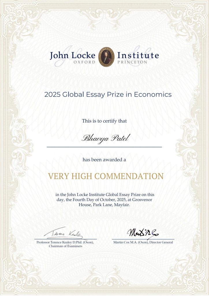 We are pleased to congratulate Bhavya Patel on being awarded a Very High Commendation in the Economics category of the John Locke Institute’s 2025 Global Essay Prize.