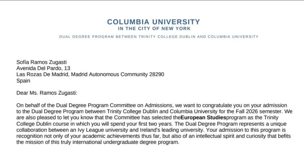 Hello everyone, We are thrilled to celebrate Sofía Ramos Zugastion’s admission to the Dual Degree Program at Columbia University and Trinity College Dublin, Class...