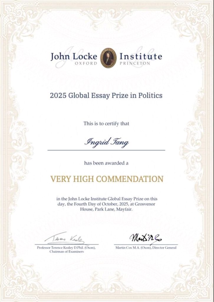 We are pleased to congratulate Ingrid Tang on being awarded a Very High Commendation in the Politics category of the John Locke Institute’s 2025 Global Essay Prize. It is remarkable that, as an incoming Year 9 student, she entered the Senior category rather than the Junior category.