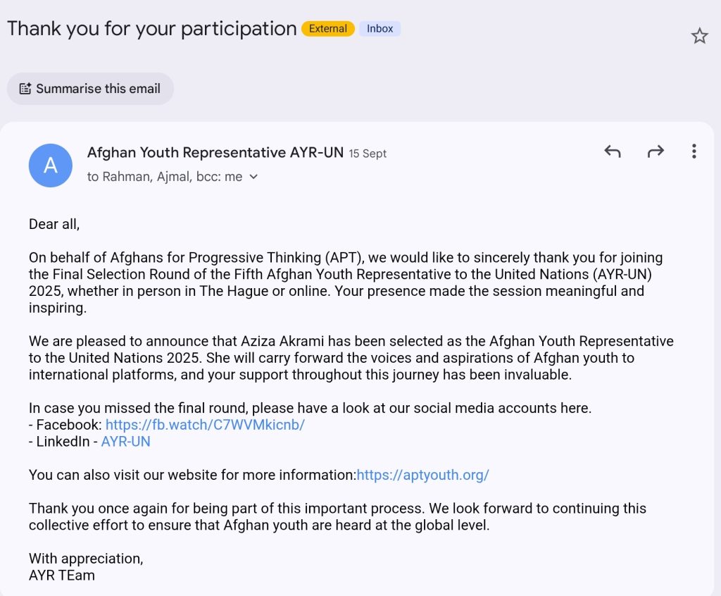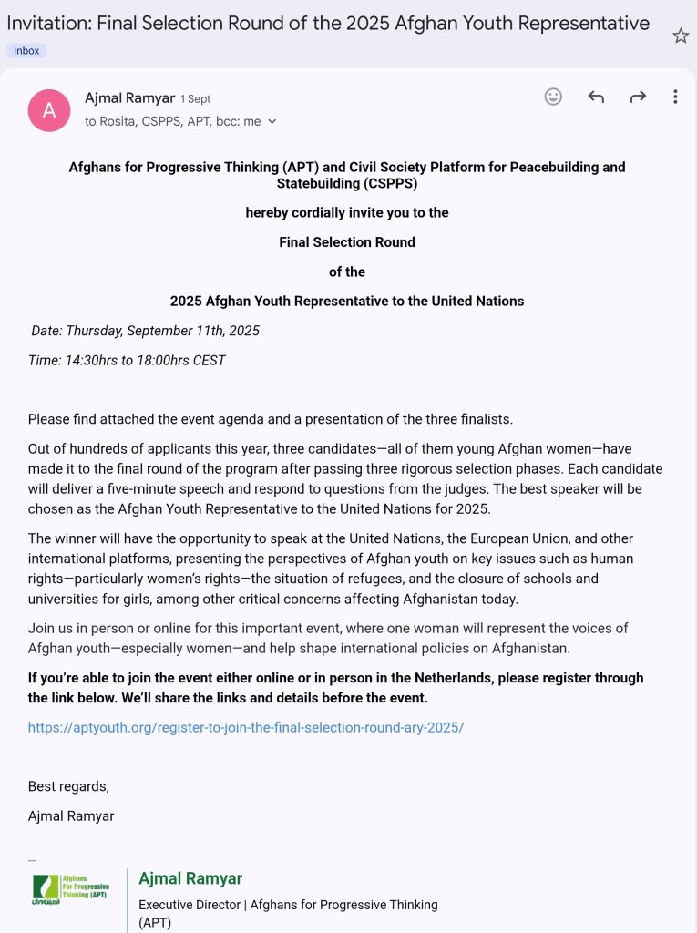 Inspire Youth Journal was honored to be cordially invited by Afghans for Progressive Thinking (APT) and the Civil Society Platform for Peacebuilding and Statebuilding (CSPPS) to the Final Selection Round of the 2025 Afghan Youth Representative to the United Nations, held on September 11, 2025, in the Netherlands.