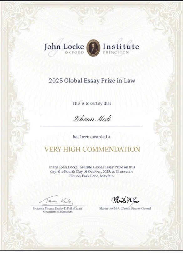 We are pleased to congratulate Ishaan Modi on being awarded a Very High Commendation in the Law category of the John Locke Institute’s 2025 Global Essay Prize.