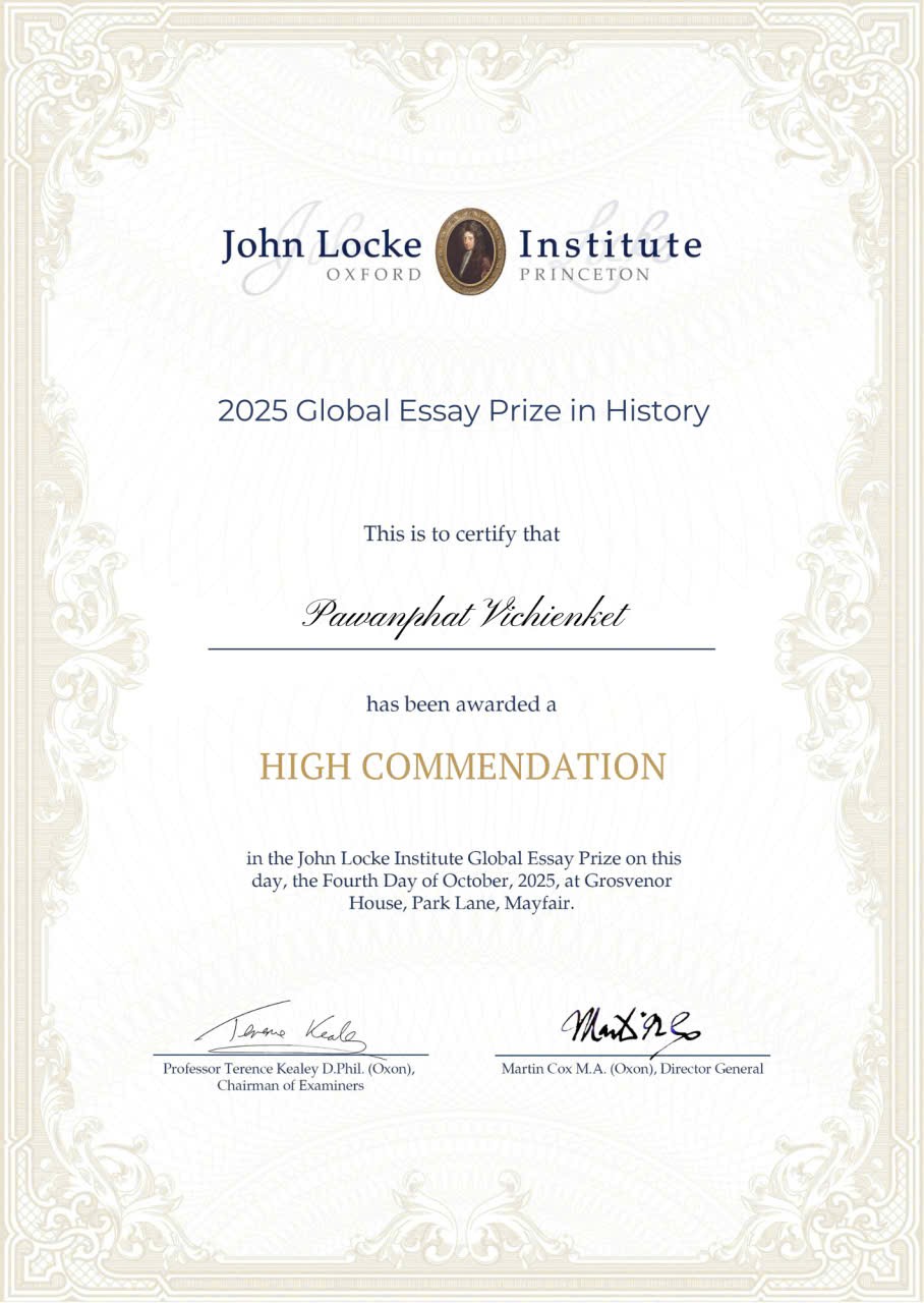 We are pleased to congratulate Pawanphat Vichienket on being awarded a High Commendation in the History category of the John Locke Institute’s 2025 Global Essay Prize.
