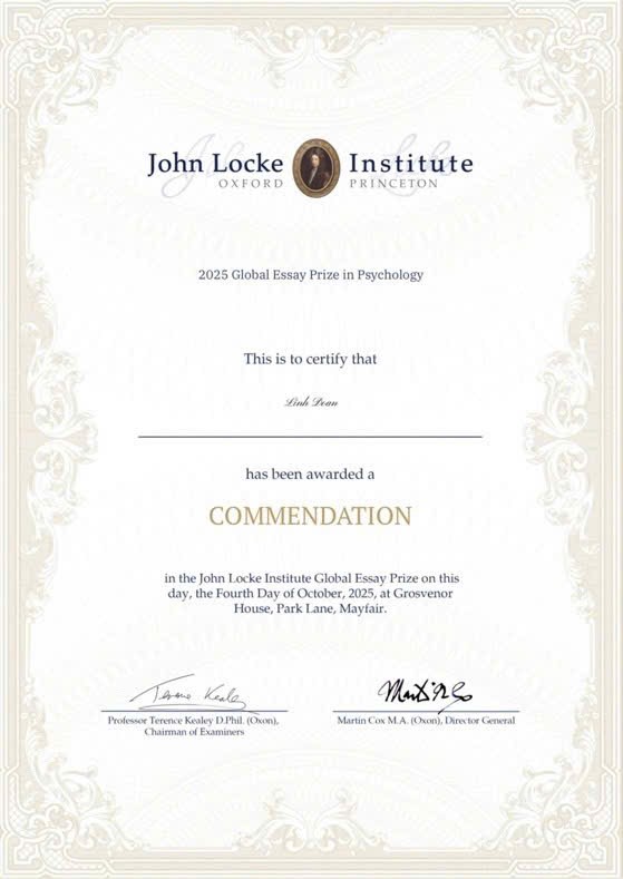 We are pleased to congratulate Phuong Linh Doan Ngoc on being awarded a Commendation in the Psychology category of the John Locke Institute’s 2025 Global Essay Prize.