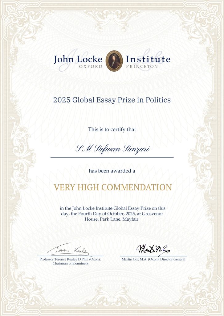 We are pleased to congratulate S M Safwan Sanzari on being awarded a Very High Commendation in the Politics category of the John Locke Institute’s 2025 Global Essay Prize.