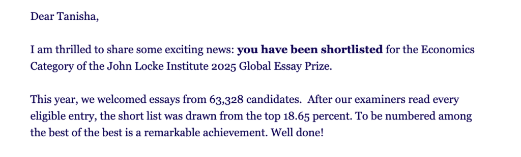 We are pleased to congratulate Tanisha Kinikar on being shortlisted for the Economics category of the John Locke Institute’s 2025 Global Essay Prize.