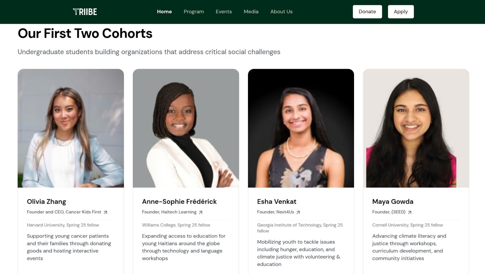 Our cohorts prioritize quality over quantity because we work with founders for three full years. Each semester, TRIIBE branches welcome a new cohort of five nonprofit founders, each with real operating experience, and each already running their foundation for an average of six years. Several have already been recognized as Forbes 30 Under 30, George Bush Points of Light Fellows, and L’Oréal Women of Worth.”