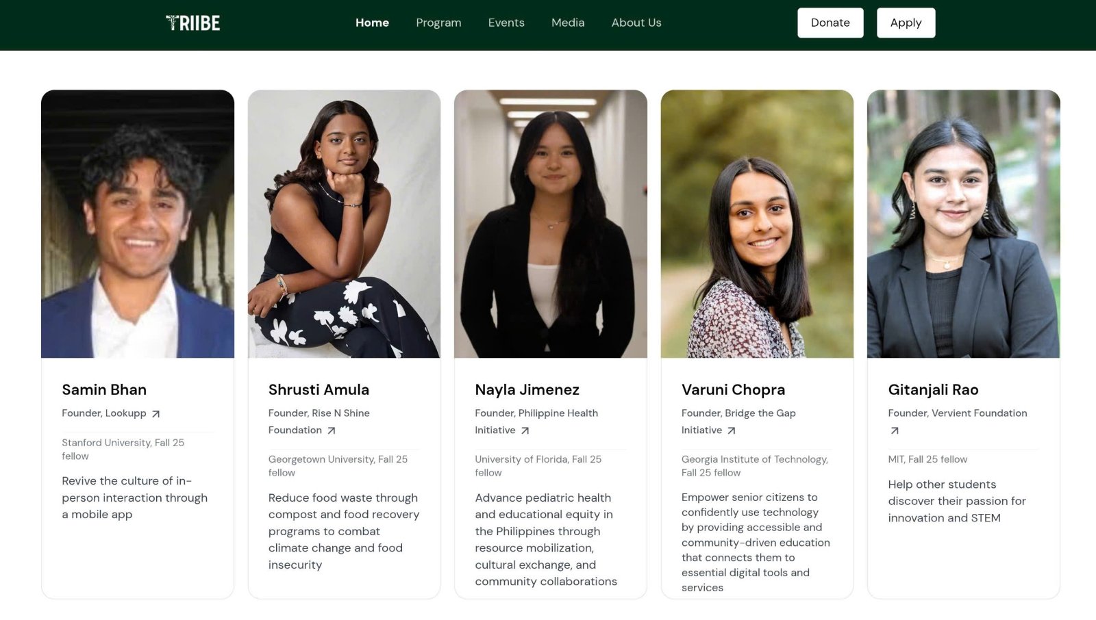 TRIIBE is the missing pipeline for social impact. We operate a fellowship built for nonprofit founders, a clear path through college with the three things early-stage founders actually need: funding, mentorship, and community.